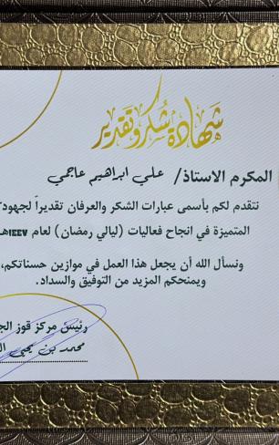 تقديرًا لعطائه المستمر وجهوده في خدمة المجتمع رئيس مركز قوز الجعافرة الأستاذ/محمد بن يحيى اللغبي يوجه خطاب شكر وتقدير لسعادة رئيس مجلس إدارة جمعية التنمية الاهلية بقوز الجعافرة الأستاذ/علي ابراهيم ناصر عاجمي كل التهاني بهذا التقدير المستحق. #السعودية...