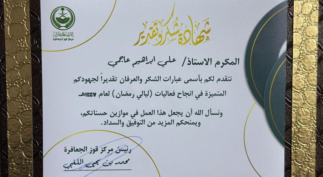 تقديرًا لعطائه المستمر وجهوده في خدمة المجتمع رئيس مركز قوز الجعافرة الأستاذ/محمد بن يحيى اللغبي يوجه خطاب شكر وتقدير لسعادة رئيس مجلس إدارة جمعية التنمية الاهلية بقوز الجعافرة الأستاذ/علي ابراهيم ناصر عاجمي كل التهاني بهذا التقدير المستحق.